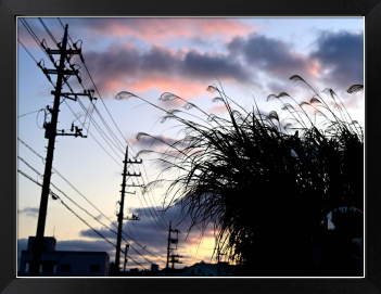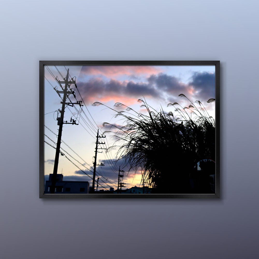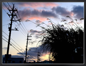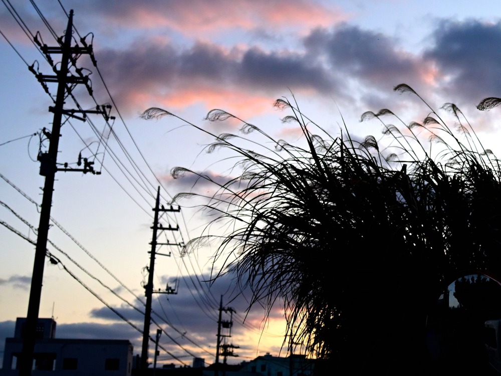 沖縄の3月の夕暮れの道、ススキの穂が夕焼けに映えていました。