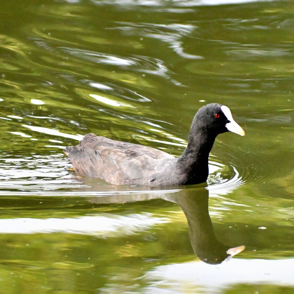 越冬組で賑わう公園の池にオオバンが勢いのある波紋を立てていました