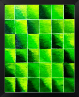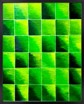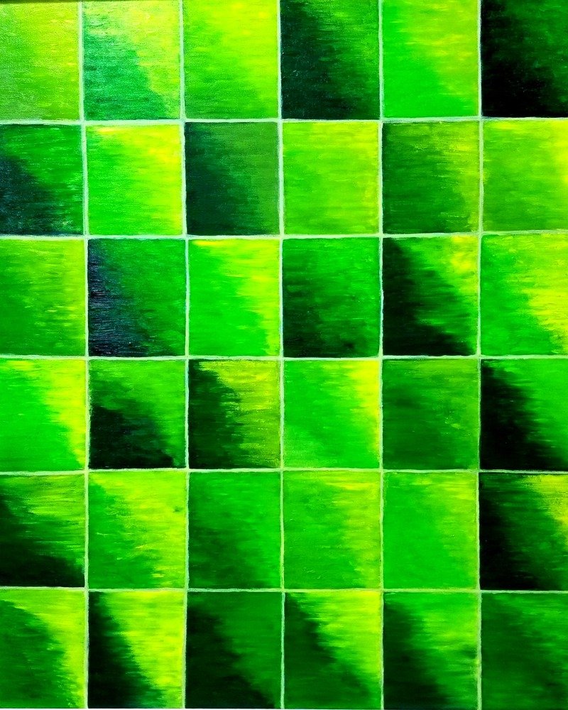 規則的なグリッドの中に、緑の生命力と光が重なり合う瞬間を、絵に込めたいという強い思いを長い間温めていました。