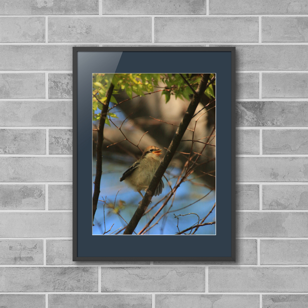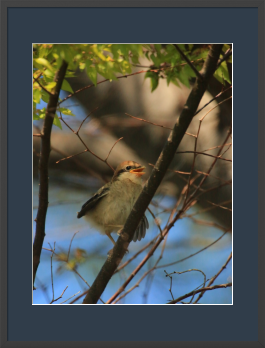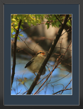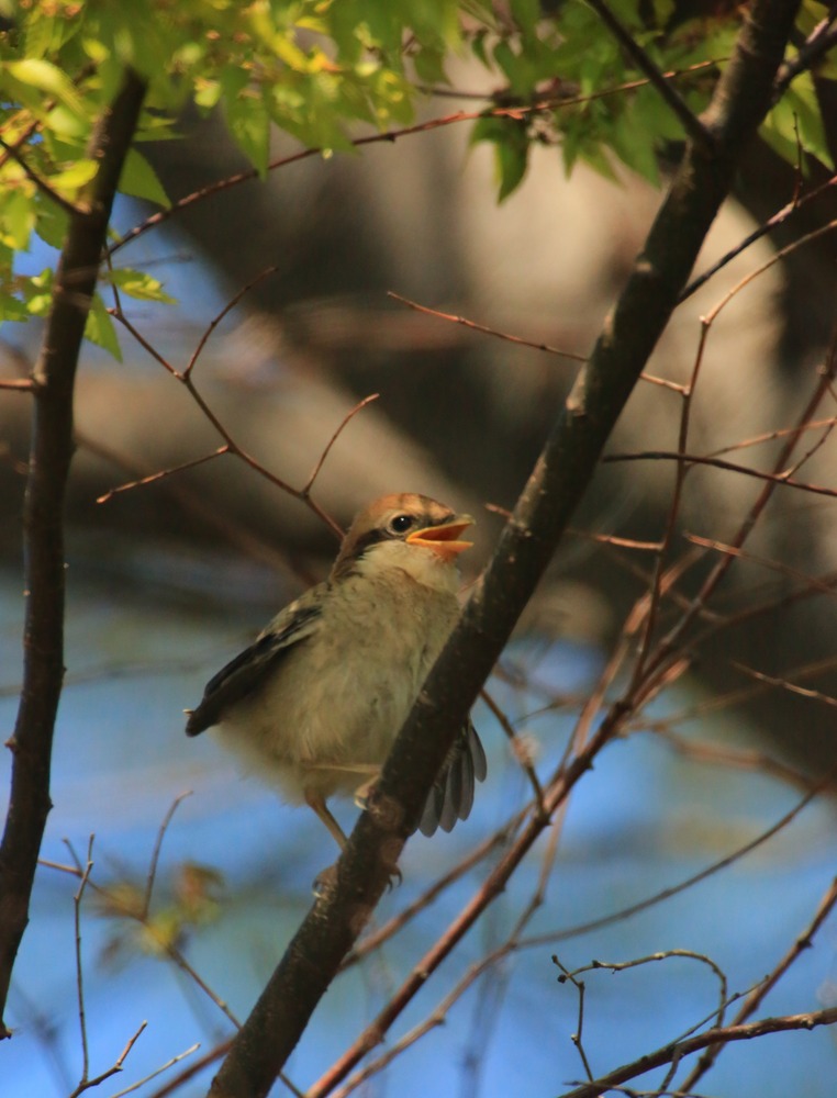 巣立ち後1-2日、ほやほやのモズの幼鳥が藪から出てきました。餌を咥えた親鳥が直ぐに飛んで来るはずです。