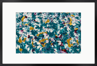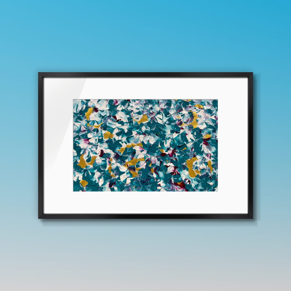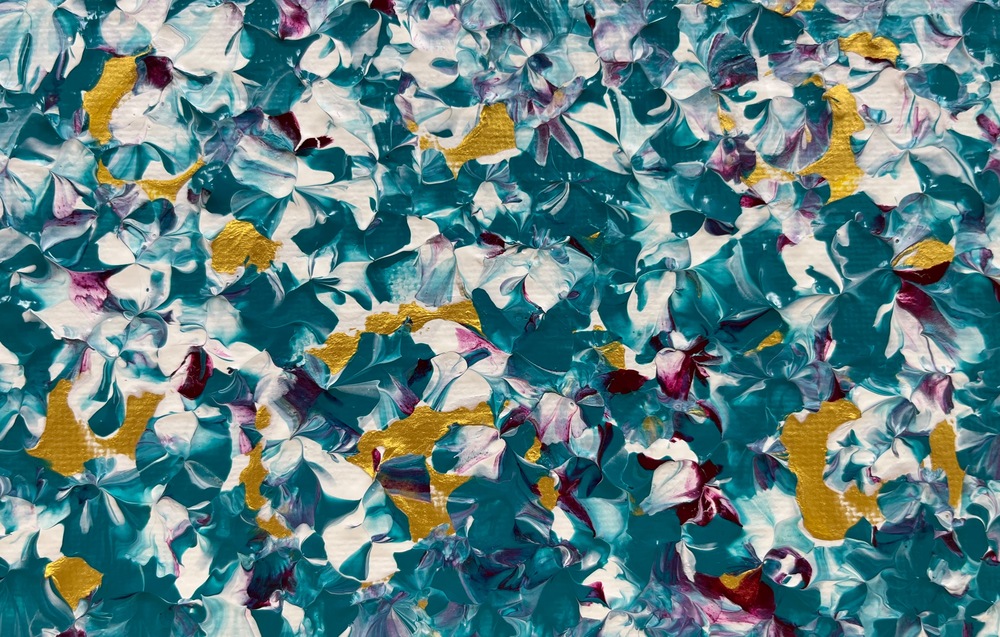 An acrylic abstract painting where vibrant shades of turquoise, gold, and burgundy come together, filling the canvas with the essence of a blessing. Display it in your home or workspace to invite a spiritual energy that illuminates your path through the night and guides you into the morning.