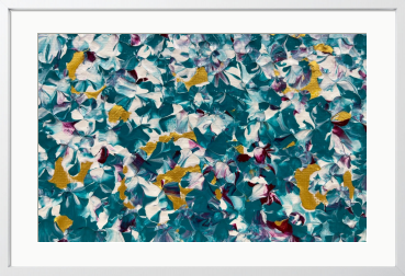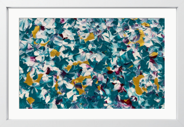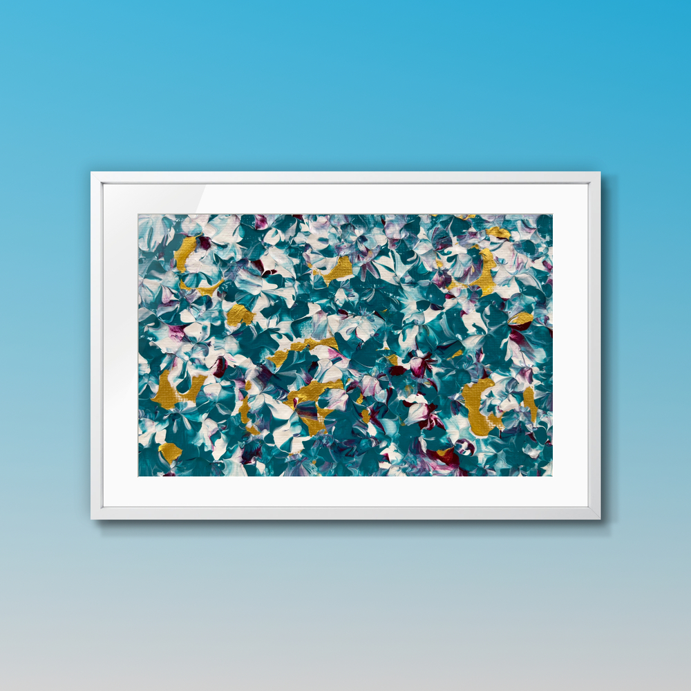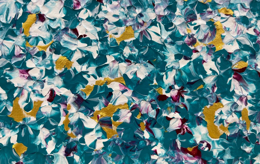 An acrylic abstract painting where vibrant shades of turquoise, gold, and burgundy come together, filling the canvas with the essence of a blessing. Display it in your home or workspace to invite a spiritual energy that illuminates your path through the night and guides you into the morning.
