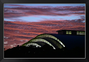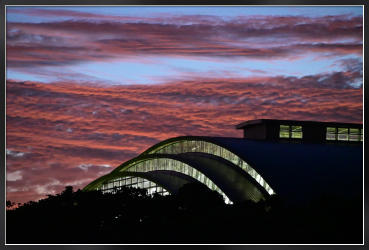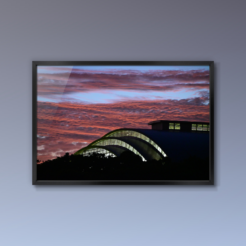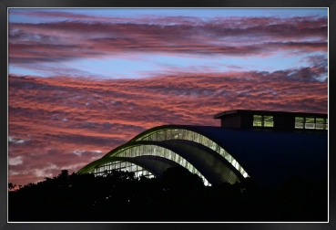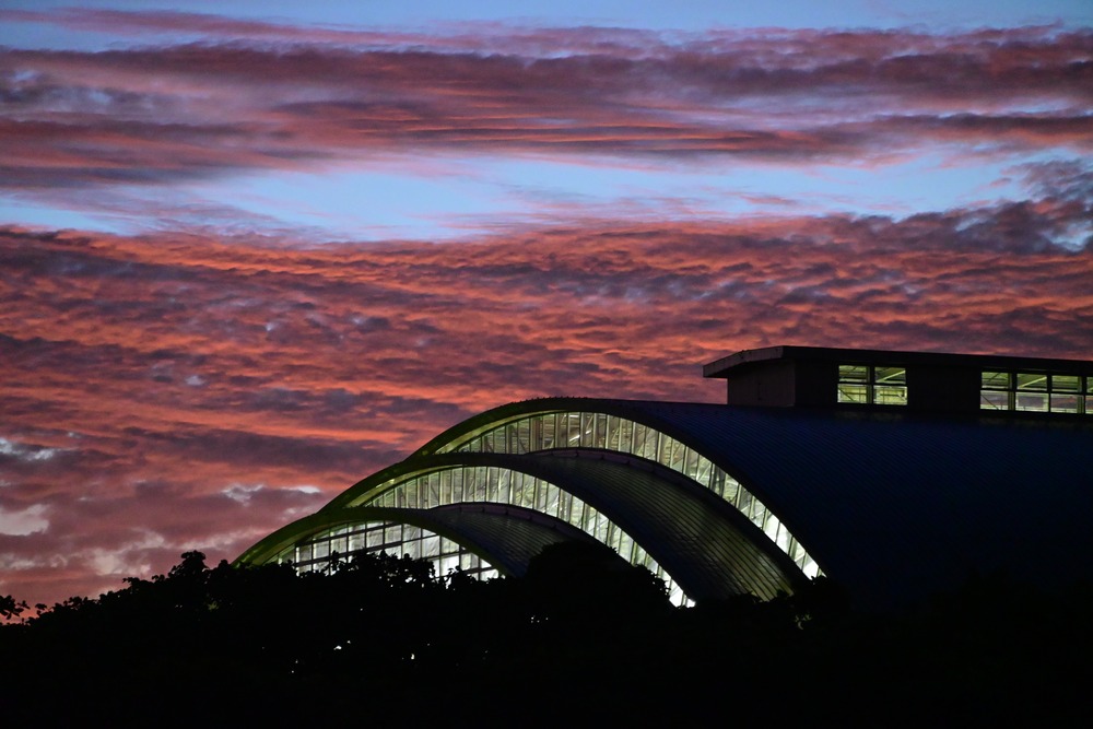 沖縄県総合運動公園のレクリエーションドームのガラスが照明に輝く様子