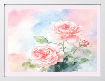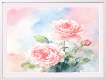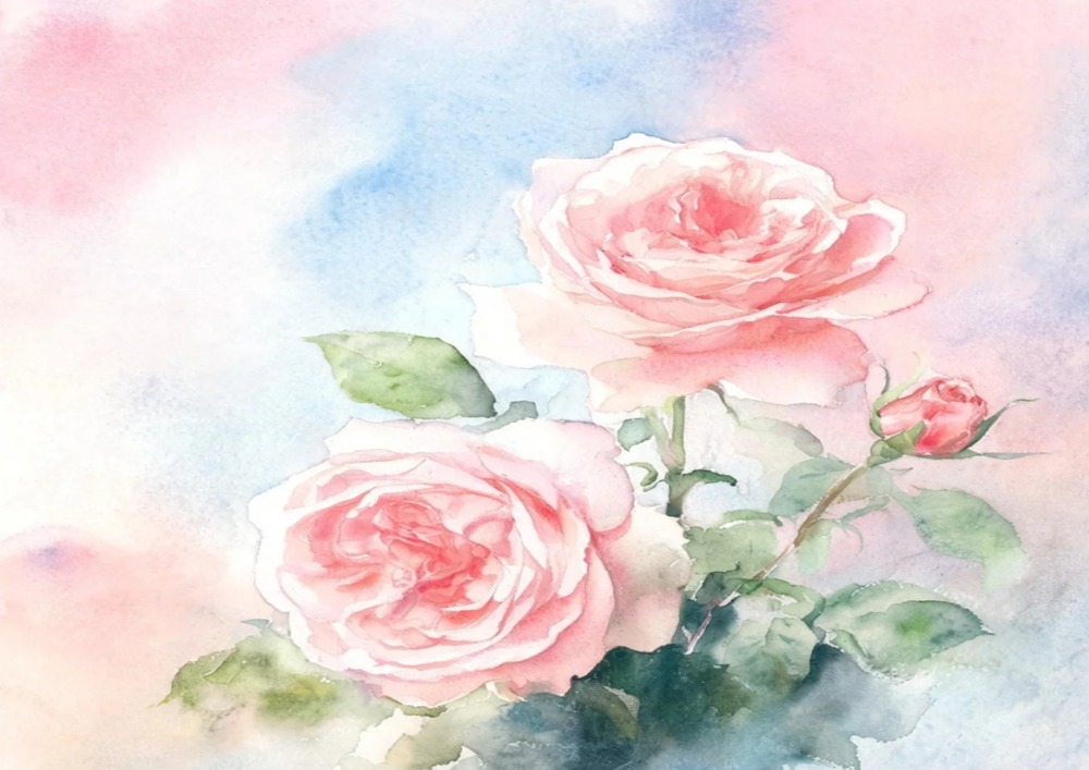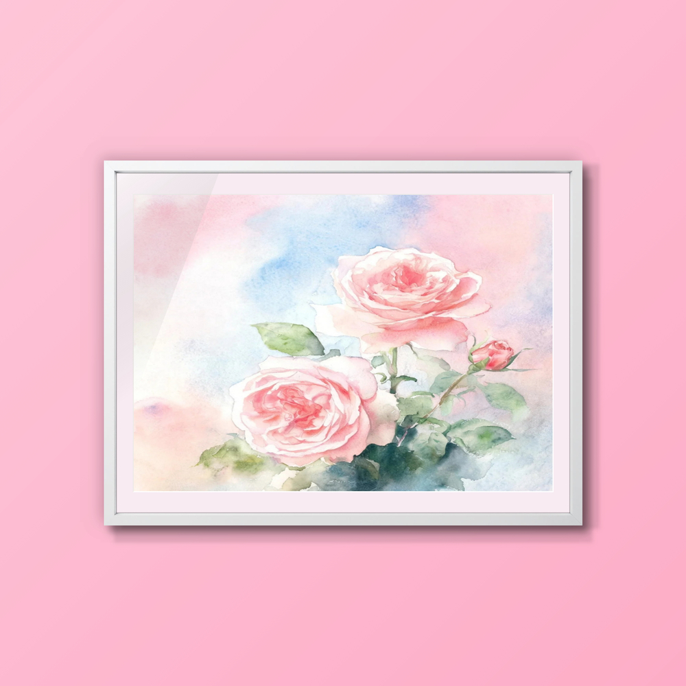 淡い水彩の滲みの中に、凛と、それでいて優雅に咲き誇る薔薇を描きました。 朝の柔らかな光が差し込み、花びらの端から色が溶け出していくような、儚くも美しい瞬間を表現しています。背景のブルーとピンクが混ざり合う色彩は、心に静かな安らぎをもたらします。 忙しい日常の中で、ふと目を向けた時に心がふんわりと軽くなるような、そんな「癒しの空間」を演出する一枚です。大切な方へのギフトや、寝室・リビングのアクセントにいかがでしょうか。