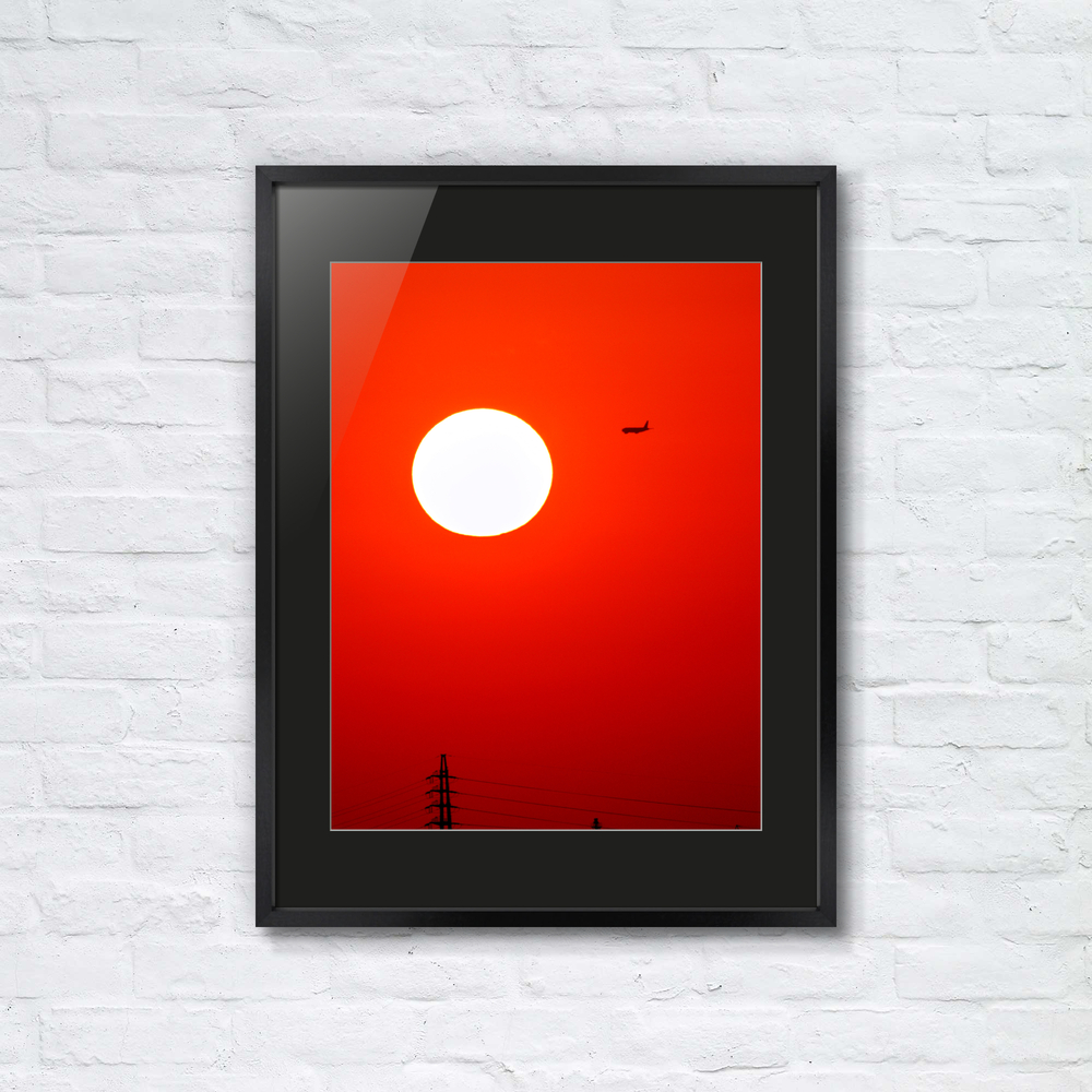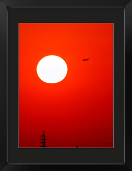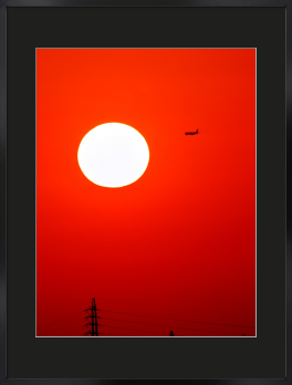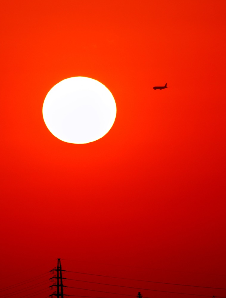 燃えるような赤い空に浮かぶ太陽。 その縁をかすめるように、一機の飛行機が通過する瞬間を捉えました。
