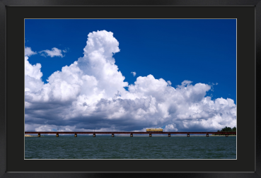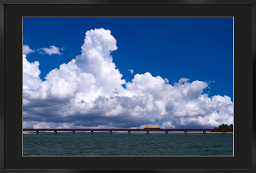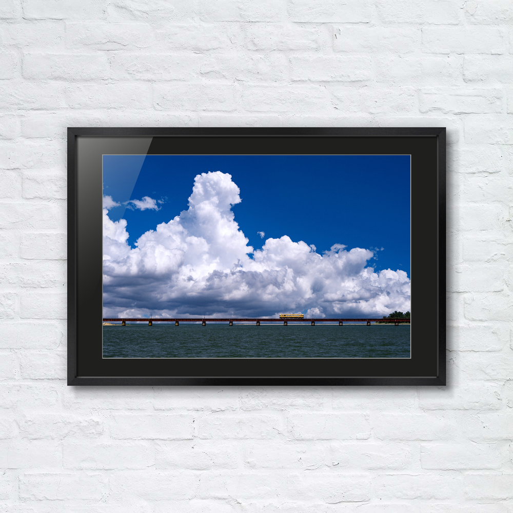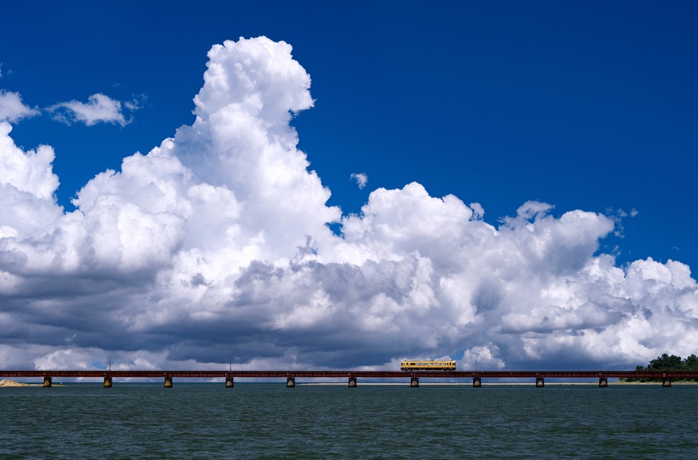 京都府北部、由良川に架かる由良川橋梁を通過する列車を撮影した一枚です。 夏特有の積乱雲が発達する中、橋梁を一直線に進む列車と、広がる空との対比が特徴です。